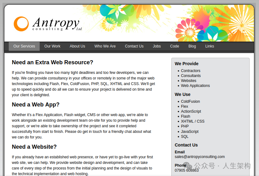 当然,在起步阶段,我独自设计并建立了Antropy的第一个网站,网址是antropyconsulting.com,后来在一位早期客户的建议下,我们将域名缩短为了antropy.co.uk——这位客户对商业有着深刻的理解,因为他最近以1.5亿欧元的价格出售了他的公司,不过那是另一个故事!