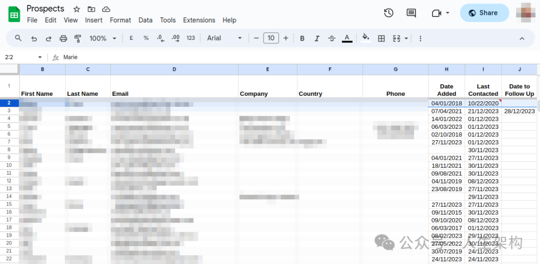 即使刚开始仅使用电子表格,构建数据库或CRM系统中的联系人列表也是必不可少的。你应该添加所有联系你咨询服务的人,并确保从他们那里获得明确的答复(除非他们选择不回复,这种情况很常见,令人遗憾)。初步的记录可能就像下面展示的Google Sheet那样简单: