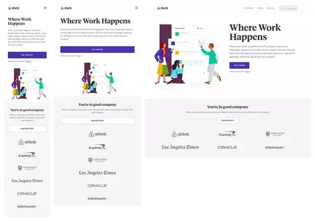 Slack的网站也易于使用。比如,在平板电脑和手机上,CTA按钮横跨整个列,这样能避免用户误操作点到登陆下面的超链接。
