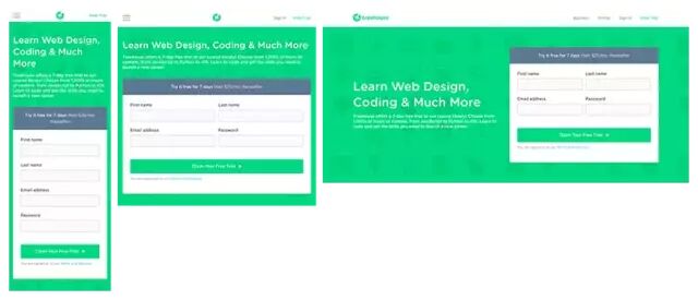类似于Treehouse,上面的折叠区域,在笔记本上占两列,手持移动设备上占一列。同时,将CTA复制到移动端的下半部分。