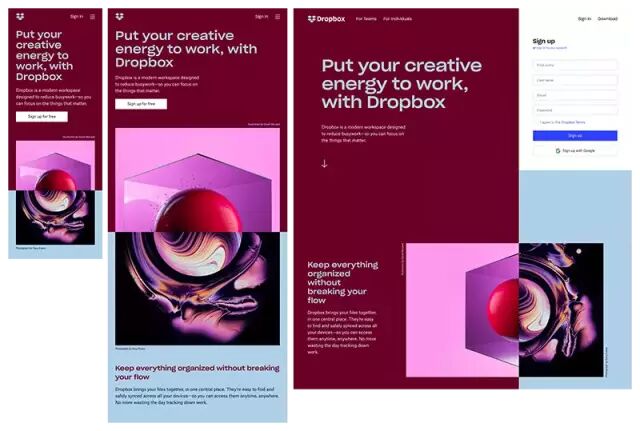 Dropbox通过做了大量工作,使用流动布局和灵活的视觉设计出色的响应网站。从桌面到手持设备,不仅使字体颜色随背景颜色改变,同时图像也会随之变化方向。