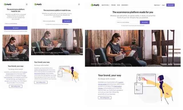 Shopify跨所有设备的用户体验是一致的。桌面端和移动设备上只有CTA按钮和插图之间的改变。