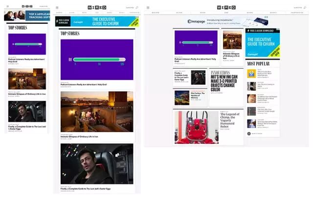 WIRED网站在桌面设备上的动态的布局有几列和一个侧栏,但在手持设备是单行的。