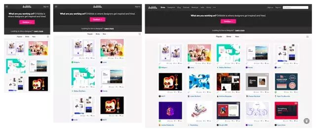Dribbble网站功能中响应网页设计是其特点之一:灵活的布局,在桌面和笔记本电脑以及平板电脑的五列和手机上呈现两列。