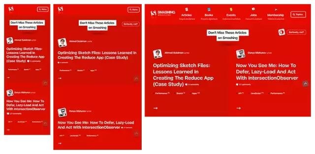 Smashing Magazine以外,在每个设备提供一个定制的体验。他们的网站功能以一个两列布局展示,完整的菜单,桌面和组合标志,但在平板电脑和移动设备,变成单列布局和使用lettermark浓缩菜单。