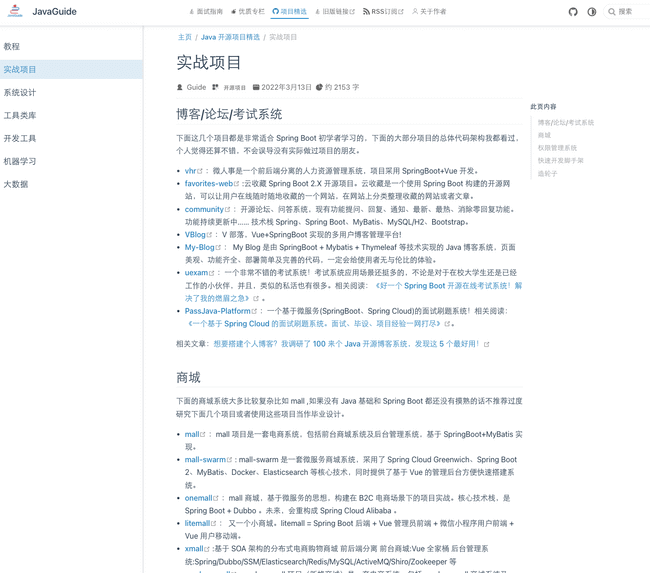 你可以在这里按照类别找到你需要的优质开源项目。就比如说在实战项目类别中,我总结了博客/论坛/考试系统、商城、权限管理系统、快速开发脚手架、轮子类项目。