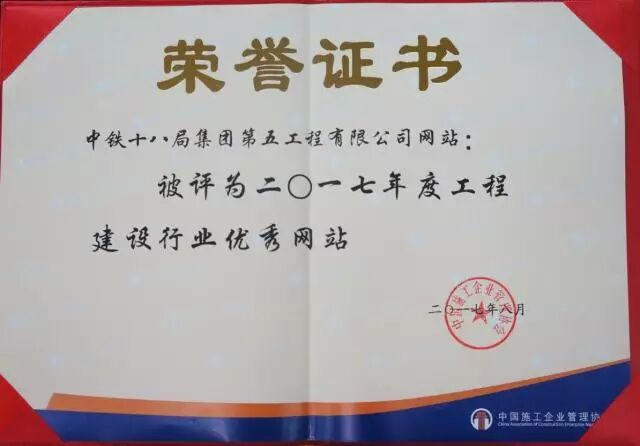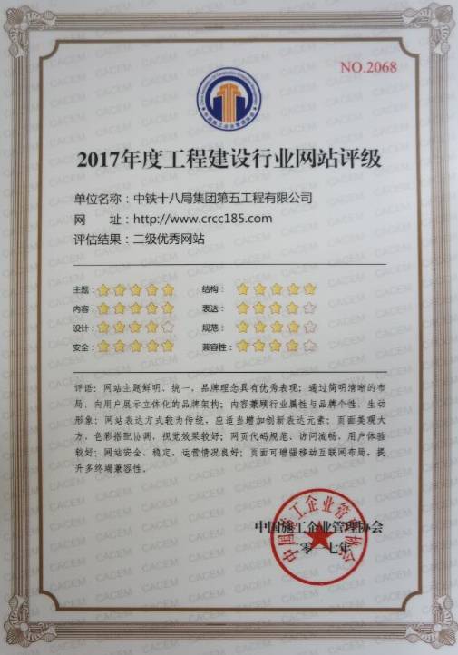 日前,从第三届工程建设行业互联网大会传来喜讯,五公司网站喜获由中国施工企业管理协会颁发的2017年度工程建设行业优秀网站荣誉证书,并被评估为二级优秀网站。