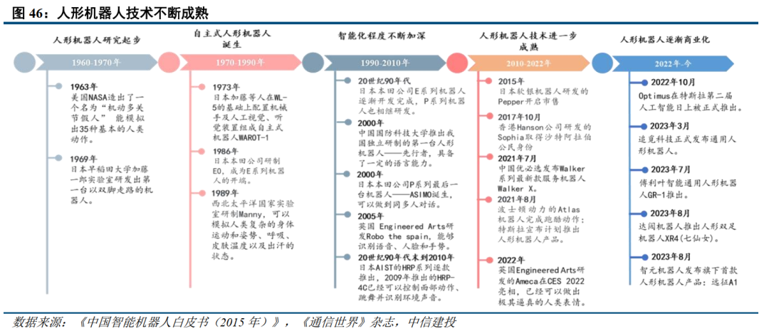 人形机器人研究起步于双足行走的模仿,在AI时代有望商业化落地。由日本早稻田大学加藤一郎教授率先解决了人形机器人的双足行走问题,至此揭开了人形机器人研究的序幕。行走机构的设计以及相应控制方法的解决推动着人形机器人迈向自主式:1973年,加藤一郎等人在WL-5的基础上配置了机械手以及人工视觉、听力装置组成了自主式机器人WAROT-1,人形机器人的研究也逐渐扩展到人工智能方面。1990年以来,机器人的行走能力、智能化和功能也越来越强大,本田公司的ASIMO是行业的典范。2010以来,互联网的发展推动人形机器人受到了更多大众关注,技术也愈发成熟,2015年,Pepper的市售是人形机器人走入大众市场的重大尝试;2021年波士顿动力旗下Atlas的跑酷视频一经发出便收获百万点赞;电动车巨头特斯拉也于2021年宣布将推出人形机器人产品Optimus(擎天柱),至此,人形机器人批量生产的商业化时代拉开序幕。