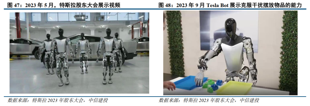 从任务执行能力来看, ① 2022年10月,Tesla Bot具备了一定的抓取、搬运、上下料功能。②2023年3月,Optimus展示了使用螺丝刀的功能。③2023年5月股东大会上,Optimus展示了双手处理任务的能力。④2023年9月,Optimus展示了仅使用视觉和关节位置编码器,即可在空间中精确定位四肢的能力,并且能够执行整理物品任务的过程中的克服人为干扰,还可以实现单腿站立和拉伸等动作。