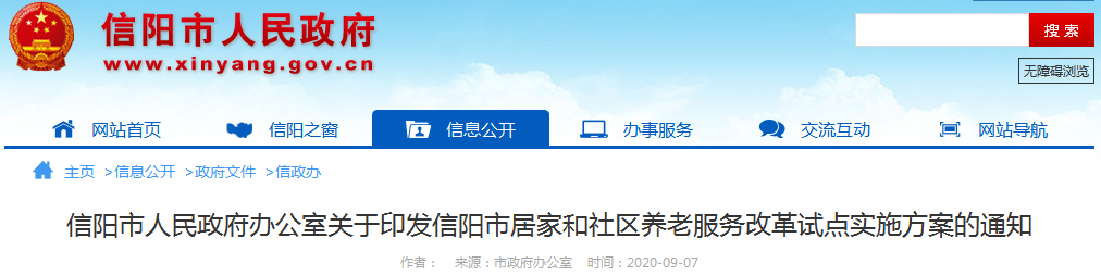 《信阳市人民政府办公室关于印发信阳市居家和社区养老服务改革试点实施方案的通知》