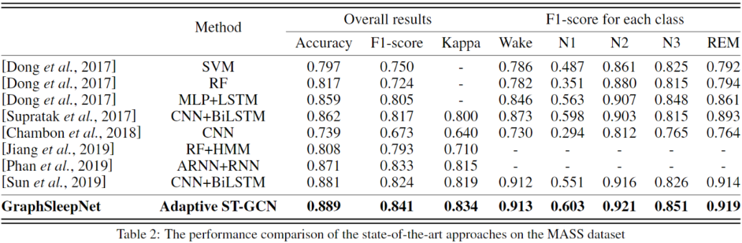 在基准数据集的实验结果表明,提出的 GraphSleepNet 优于传统的基线方法,取得了 SOTA 的性能。