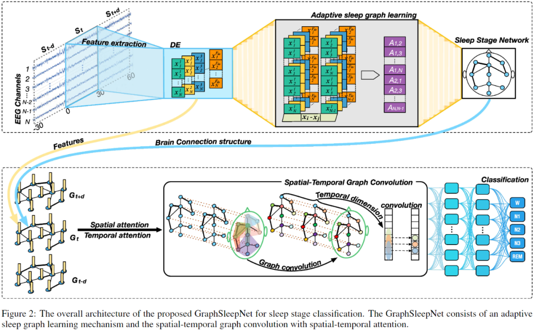 据我们所知,这是首次尝试将 ST-GCN 应用于睡眠分期领域。此外,我们提出了一种新的自适应睡眠图学习机制,它与 ST-GCN 同时被集成在统一的深度神经网络的架构中。