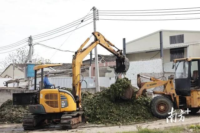2月3日下午,两辆铲车出现在仓库门口,工作人员操作挖掘机将地上的芥菜搬运到仓库。南方日报、南方+ 吴明 拍摄