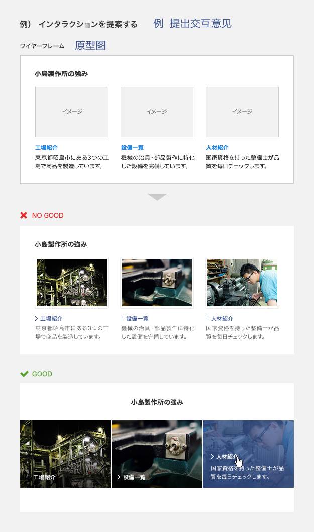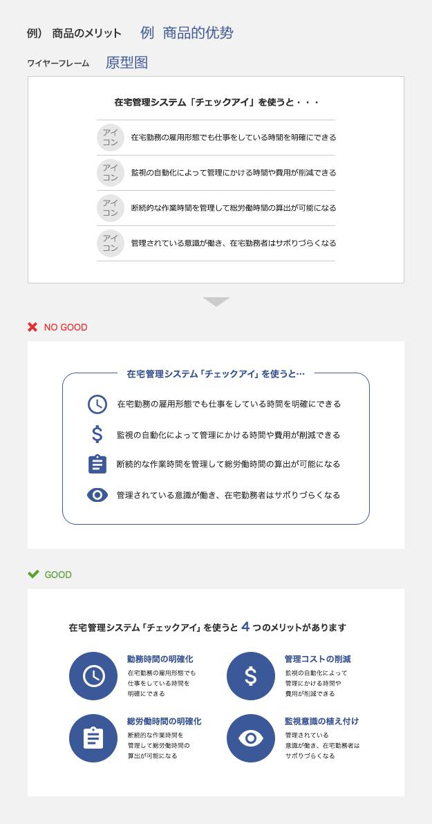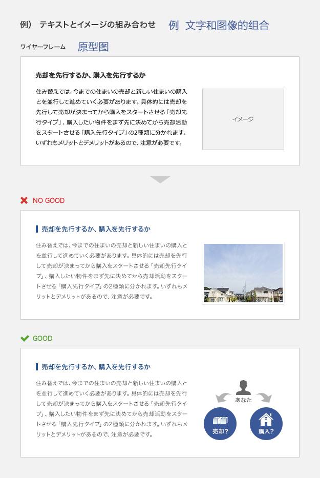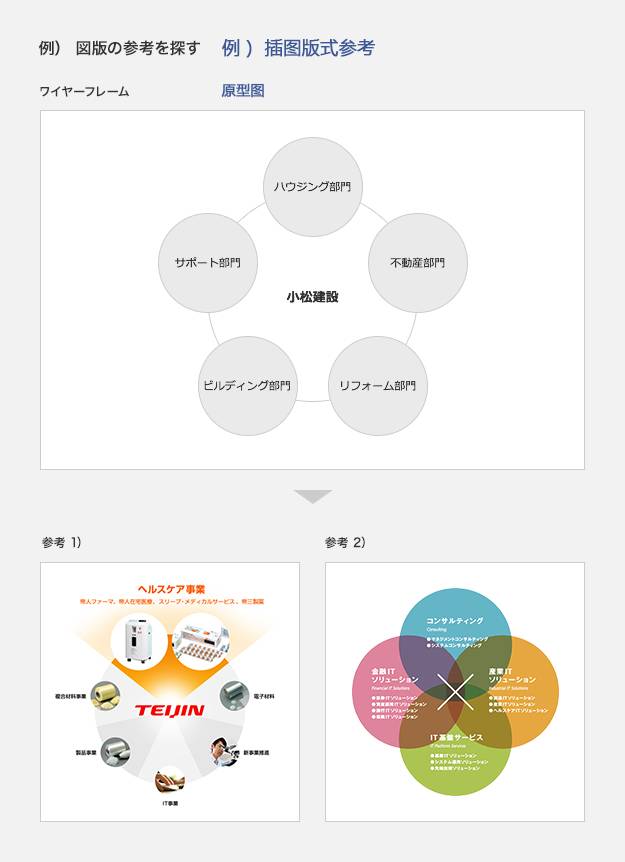 制作原型图的人希望图像能够更好地补充文章内容,所以经常使用图形语言。这时候,首先要彻底理解文章的内容。将表现氛围和实际样子的照片,换成将关联性和数值更易向观者传达的图形也是一种很好的选择。哪一种方式更合适,需要设计者仔细阅读内容之后进行判断。
