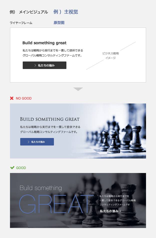 NO GOOD 设计图,按照原型图进行排版,怎么看都缺乏魅力。GOOD 设计图,大胆将英语放大,表现出视觉冲击力,去掉了按钮的样式,给人以考究的印象。对原型图这样的变化能达到更好的效果。