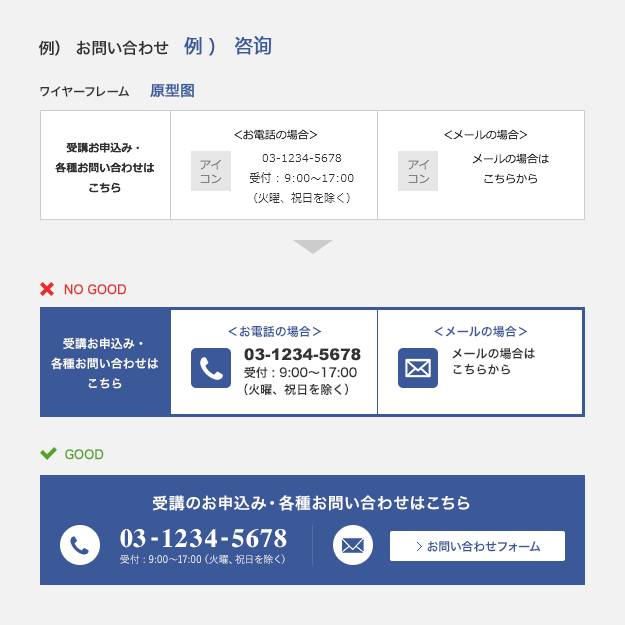 NO GOOD 设计图,标题和图标的位置,各要素的尺寸都基本和原型图一致。而GOOD 设计图,电话和邮件左右排列,体现了平衡感,邮件以按钮的形式出现,将信息的优先度很好地表现出来。