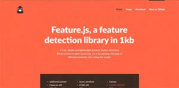 Feature.js是一款快速轻量级的浏览器侦测库。它并没有依赖库,并且压缩后只有1Kb那么小。Feature.js在加载页面的时候会自动初始化,速度非常快。