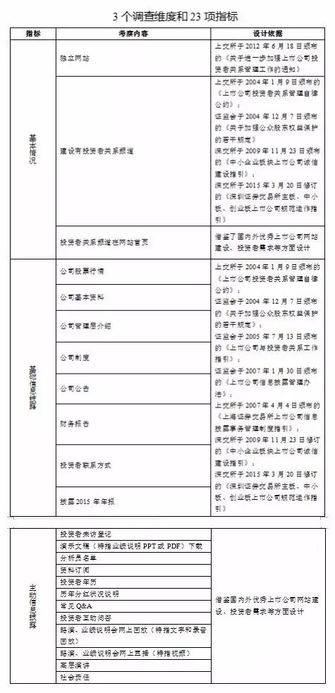 2016年4月15日至5月27日,投保基金公司组织专业人员对2807家A股上市公司(2015年底前上市,不含2016年退市和新上市的公司)网站进行浏览和使用,按照网站和IR频道建设基本情况、基础信息披露情况和主动信息披露情况三个维度,分23项指标进行逐一评价(附件)。为了采集信息的准确性、完整性、公平性,我们还对2807家上市公司采集的64561项数据进行了三轮全部数据的交叉校验,并将每家上市公司网站IR频道进行截图留档。最终形成如下调查结论: