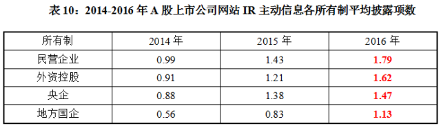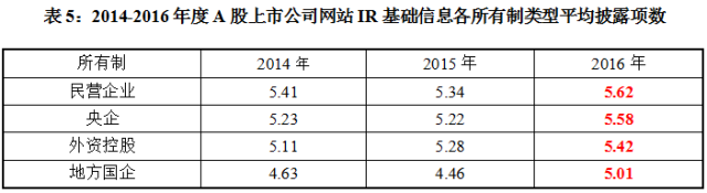 从不同所有制来看,民营企业所披露IR基础栏目最多,平均披露5.62项;其次是央企,平均披露5.58项;而外资控股和地方国企平均披露为5.42项和5.01项。从近三年情况来看,2016年各所有制平均披露水平均创三年新高,其中,民营企业平均披露情况历年皆最高。