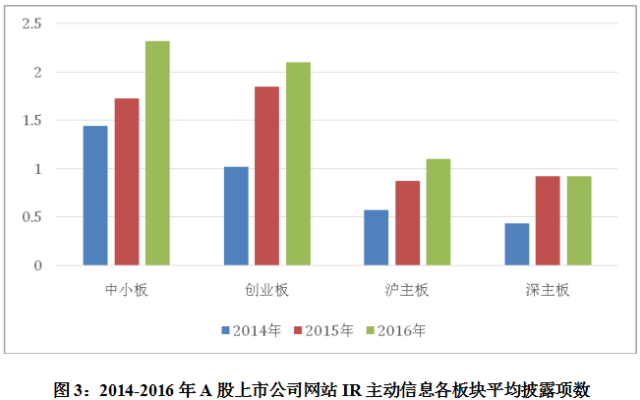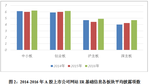 从不同板块来看,中小板披露的项数最多,平均披露有6.21项,其次是创业板,平均披露项目有6.16项。然而,沪深主板IR基础信息平均披露均不足5项。从近三年情况来看,各板块披露水平均有不同程度的提升。