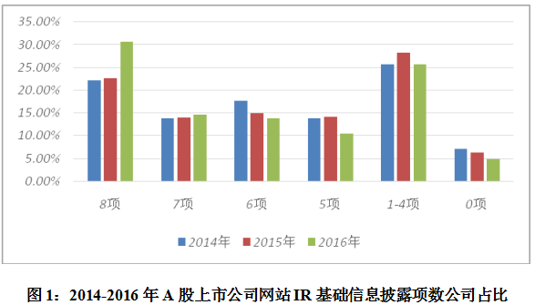 基础信息披露情况共设置8项指标,考察上市公司8项基础信息的披露情况,即公司股票行情、公司基本情况、管理层介绍、公司制度、公司公告、财务报告、投资者联系方式和2015年年报。调查显示: