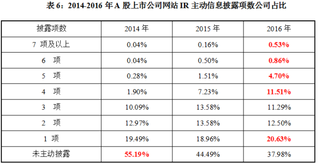 调查显示,今年共有62.02%上市公司进行了主动信息披露,较去年增加了6.51个百分点。在12项主动披露信息中,受调查公司平均主动披露信息1.58项,较2015年的1.28项提升23.44%,披露4项以上信息的公司占比逐年增多。