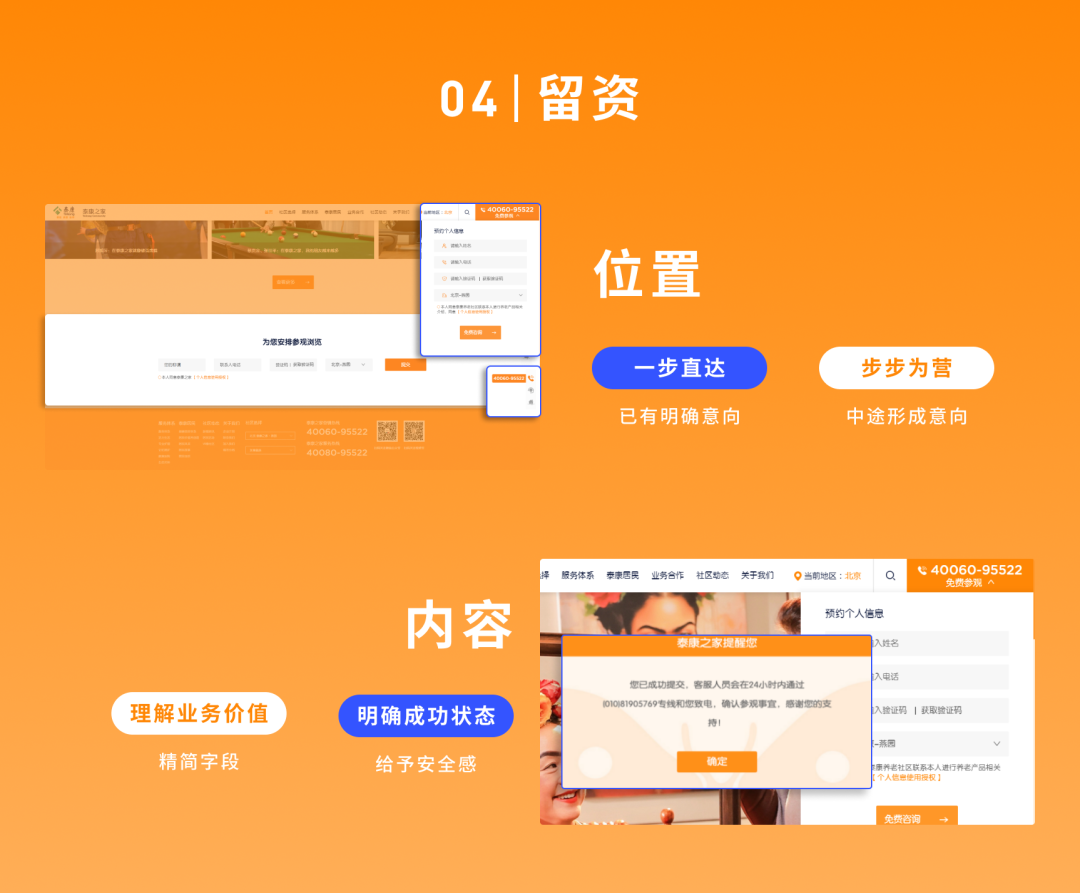 在设计泰康之家网站时,从刺激留资这个最终目标来讲,我们设计了以下细节: