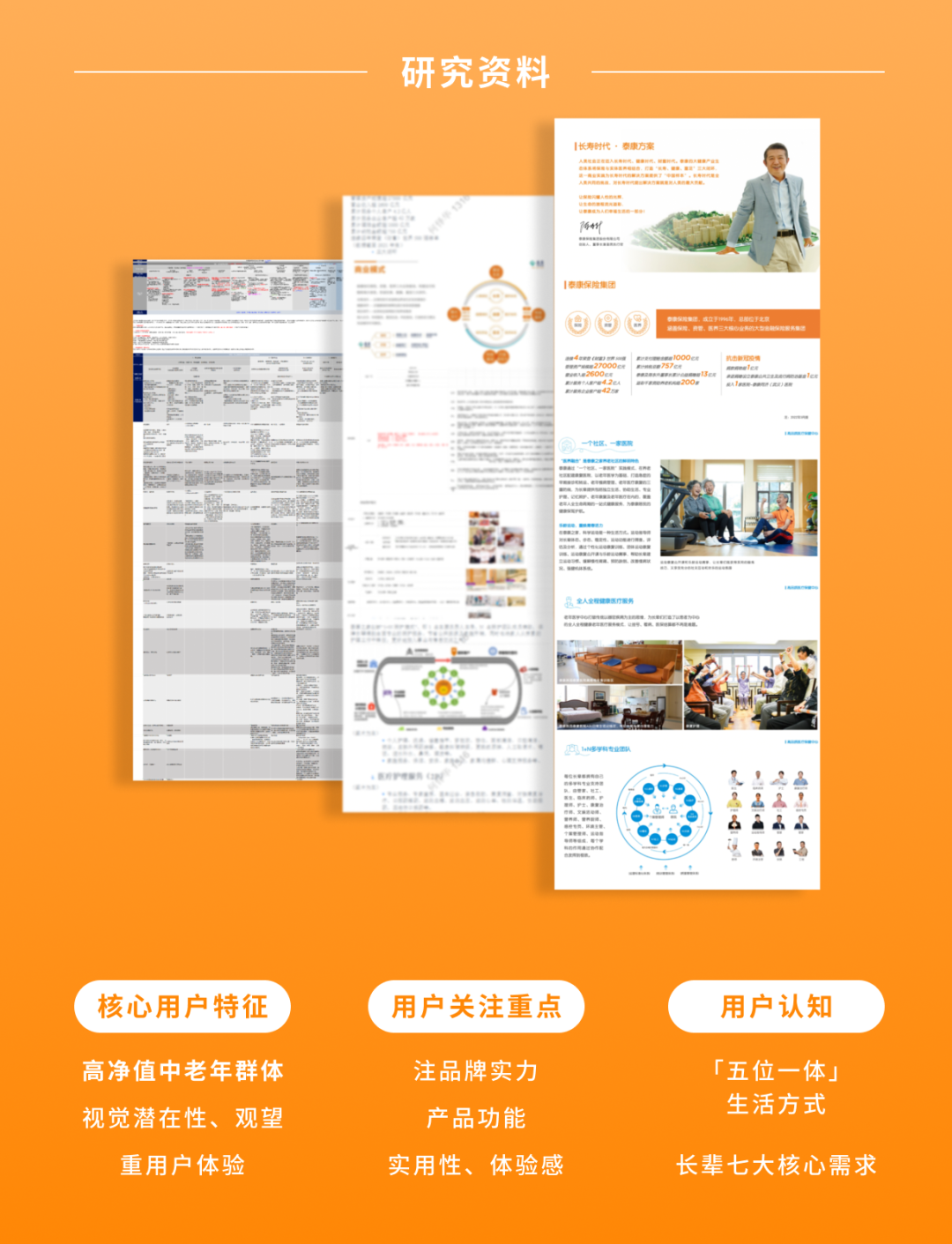 以泰康之家为例,其主要目标人群是高净值中老年群体,我们通过第三方报告搜集用户画像信息,包括消费习惯、生活习惯、喜爱的品牌、爱去的网站等等,发现他们对品质有自己的要求,每天的网络生活时间长,爱社交分享。