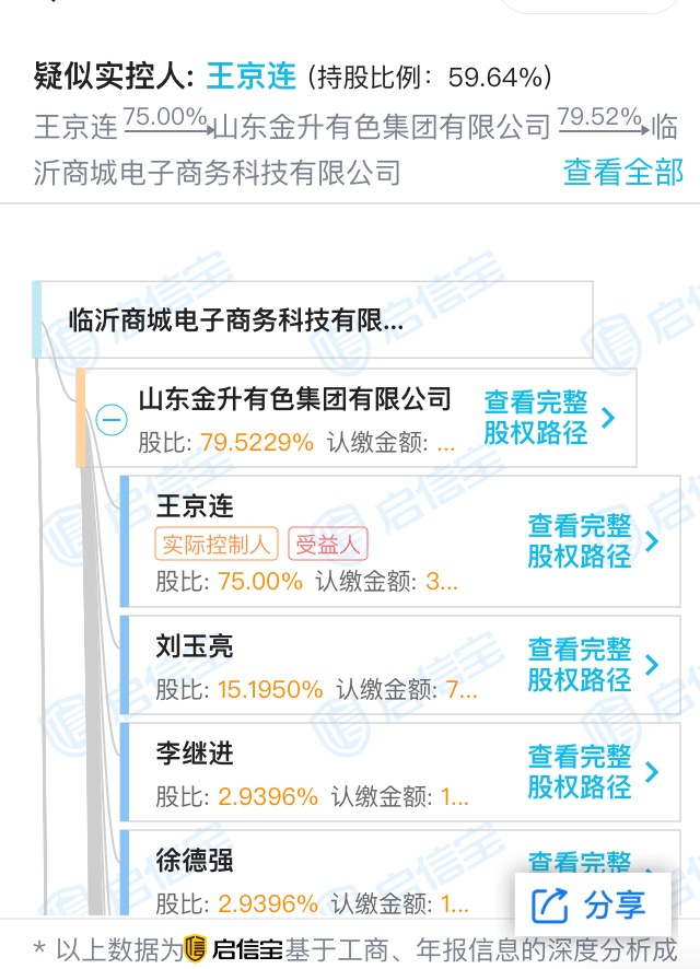 启信宝信息显示,临沂商城电子商务科技有限公司注册资本为1亿元,共有9家股东,兰山商城管委会全资子公司兰山商城控股有限公司是二股东,第一大股东即金升有色,持有79.52%股份。