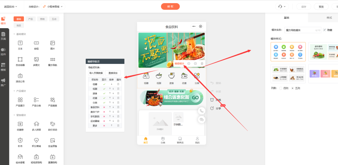 对选择的小程序商城模板进行店铺装修,都是可视化操作,一般店铺装修的内容包括模板风格、分页导航、各种模块(轮播图、商品列表、商品展示样式、广告图等),同时在后台可以设置商品分类并且上传商品了。