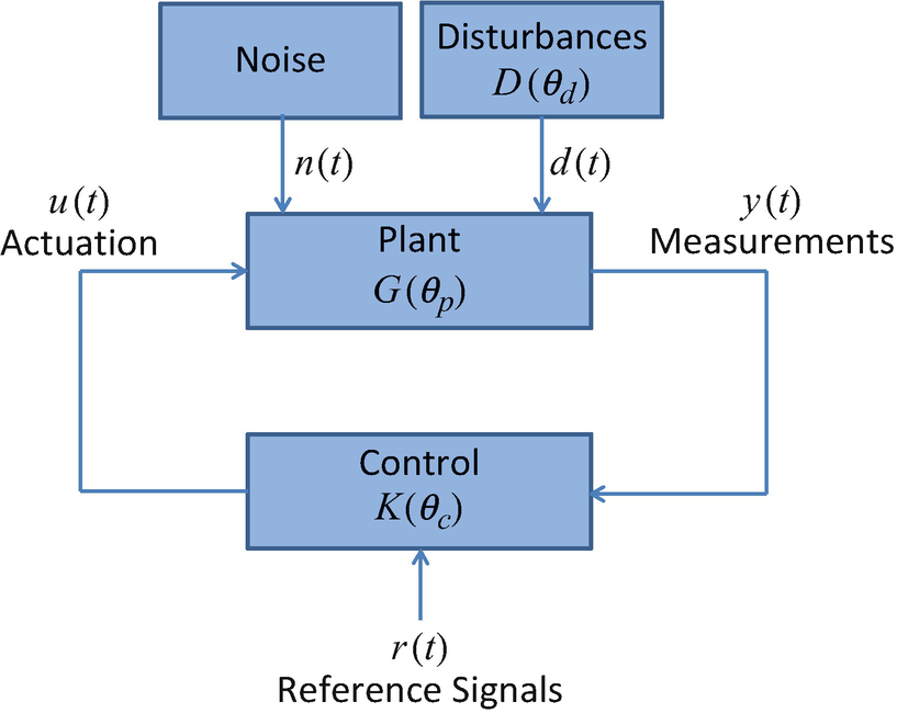 反馈控制有着悠久的历史,它使用感测、决策和执行元件来实现总体目标。控制系统的一般结构可以在图1中说明。人们早已知道,高保真度控制依赖于对被控系统的了解。例如,在大多数情况下,了解受控体(plant)增益和/或时间常数(图1中用θp表示)对于反馈控制设计很重要。此外,干扰特性(例如,正弦干扰的频率),图1中的θd,在反馈补偿器设计中也很重要。