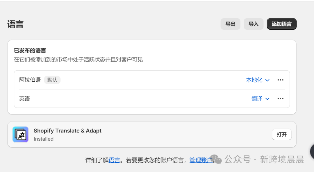 在还有独立站卖家问我哪里有设置,我这里简单介绍下shopify的多语言功能设置非常简单。我们只需在 Shopify 后台的语言设置中添加所需的语言即可。在 Shopify 网站后台左下角打开设置页面,然后选择语言 Languages,打开如下图页面: