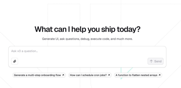 每次访问v0时,系统会自动打开聊天界面,这允许您通过对话形式与v0进行互动,无论是进行代码生成、问题解答还是执行其他开发任务。