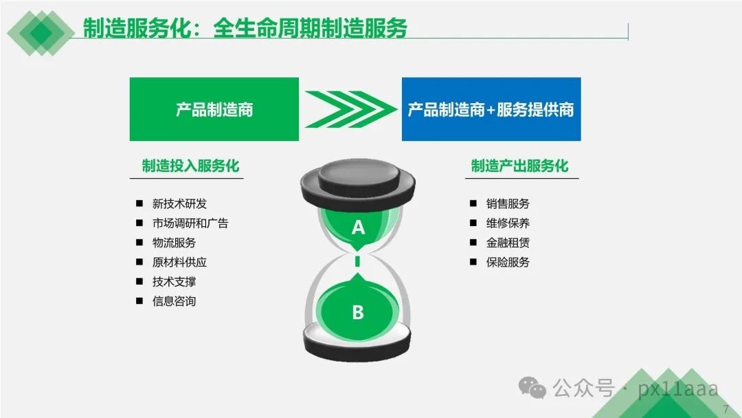 制造行业正经历着从资源驱动到信息驱动的转变,其中智能制造服务化涵盖全生命周期的服务,包括技术研发、市场调研、物流服务等。