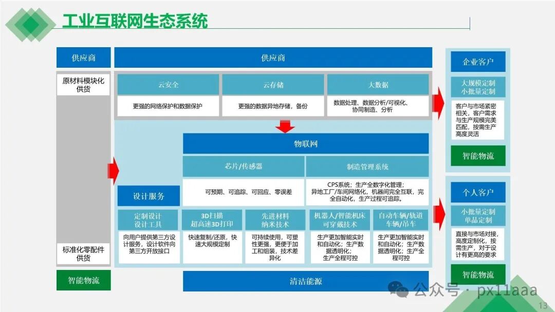 工业互联网生态系统涵盖了供应商、企业客户、原材料模块化供货、大数据、物联网、智能物流、芯片/传感器等环节,形成了一个高度集成和协同的制造环境。