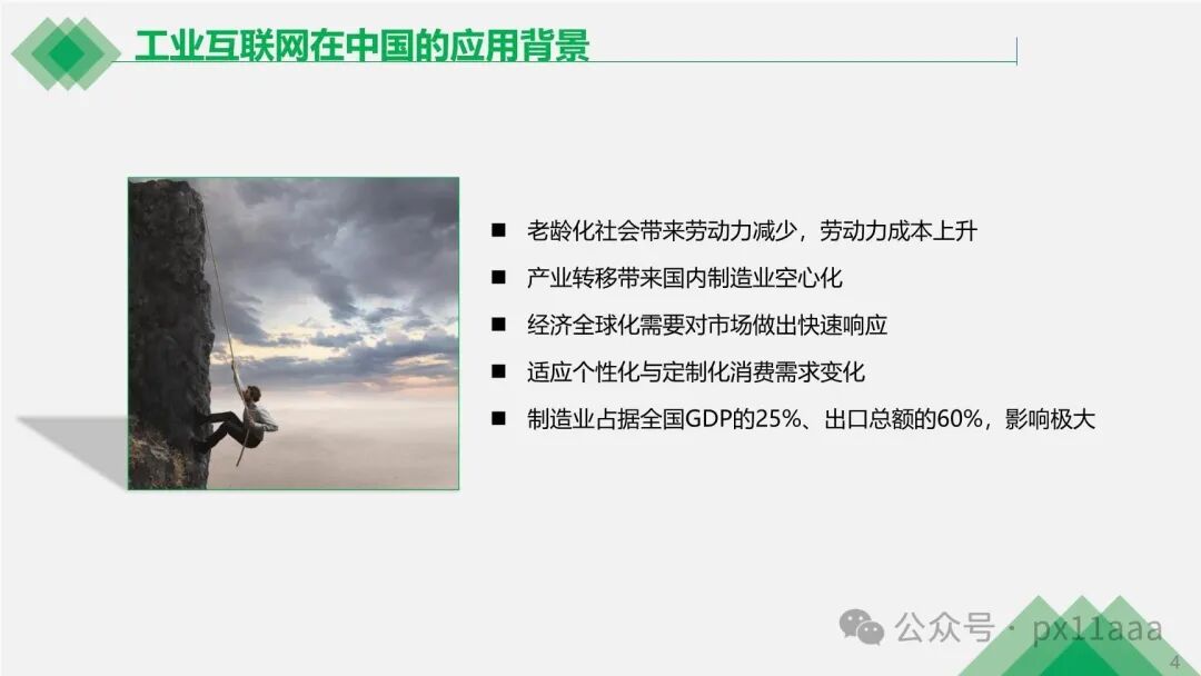 工业互联网在中国的应用背景紧密关联着劳动力成本的上升、产业转移、经济全球化以及个性化消费需求的变化。中国制造业占据全国GDP的25%和出口总额的60%,其智能化转型对经济发展具有重要影响。