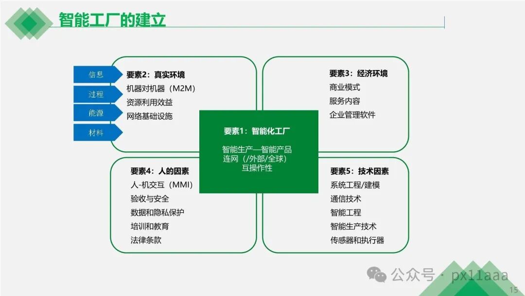 智能工厂的建立涉及经济环境、真实环境、智能化工厂、人的因素和技术因素等多个要素,通过这些要素的整合实现智能生产和智能服务。