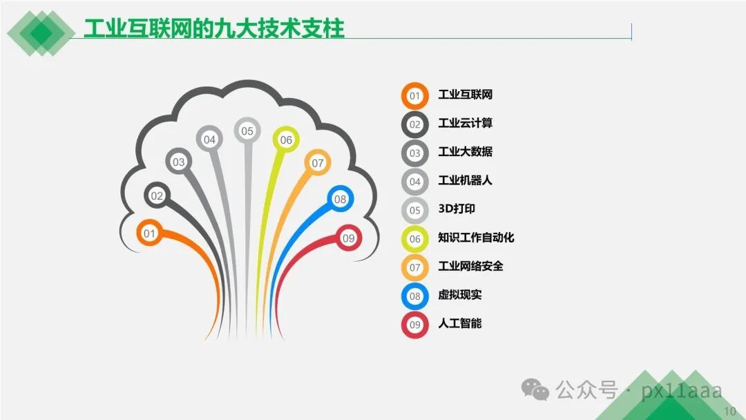 九大技术支柱包括工业云计算、大数据、工业机器人、3D打印、知识工作自动化、虚拟现实、人工智能和工业网络安全,这些技术为工业互联网的发展提供了坚实的基础。