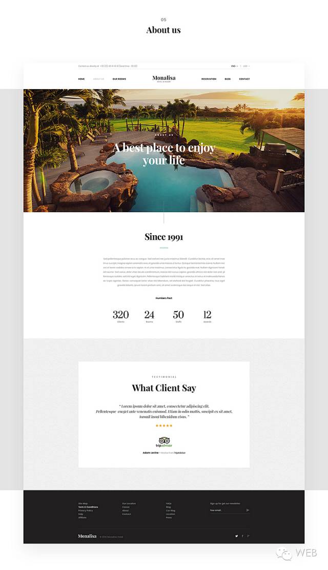 因为由于酒店行业的性质~网站主要展示酒店的特色运用了过多的图片,所以在网站首页的配色主要以深灰色和浅灰色白色为主 运用黄色和绿色作为点缀色,因为任何非彩色都不会影响彩色~
