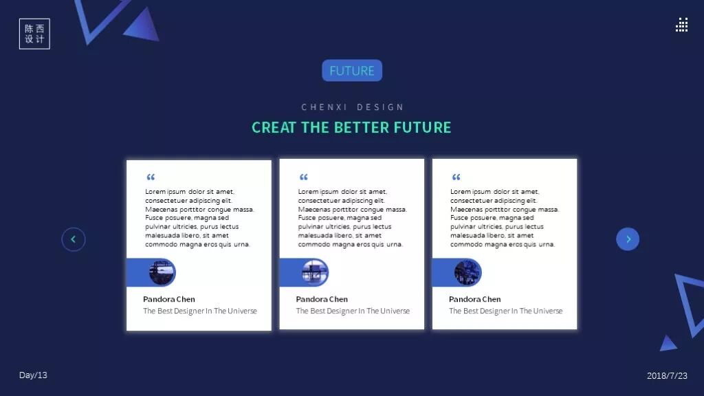 同样是一页内页的制作,使用的是卡片式的设计,但同样保留了一些装饰元素,如三角形形状的装饰,使得这三页 PPT 看上去是一个整体,一套设计风格。