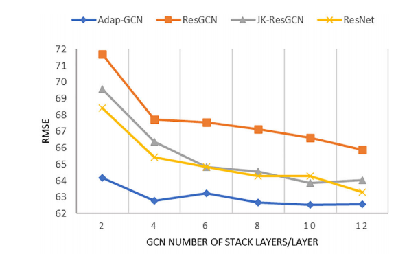 通过调整GCN的堆叠层数,详细比较了ResGCN、JKResGCN、ResNet和Adapt-GCN四种模型对总客流的预测精度(RMSE)和模型的训练时间。四种模型的对比结果如下图所示。如图所示,无论堆叠GCN层数多少,Adapt-GCN的预测精度都是最优的,尤其是在浅层网络中。这是由于Adaptive-GCN中存在自适应邻接矩阵S,它允许模型捕获浅层网络中较远车站之间的空间相关性。然而,随着数量的增加随着叠加层数的增加,其他三种模型的感受野范围逐渐扩大,Adapt-GCN的精度优势越来越不明显。在训练时间复杂度方面,Adaptive-GCN的训练时间复杂度相对于基于CNN的ResNet要差一些,因为CNN可以更好地进行并行训练。然而,与使用固定邻接矩阵的ResGCN相比,Adapt-GCN特征学习方法变得更加灵活,虽然学习参数的数量增加,但总体训练时间减少。