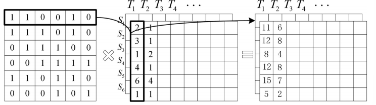 本文使用客流时间序列数据作为地铁网络中每个站点(节点)的属性特征,表示为,n表示站点个数,r表示属性特征个数,即时间序列的窗口长度,2表示进站和出站客流。如图1所示。图中,Tr表示第r个时间步m个站点的观测客流,Sm表示第m个站点,in_flow和out_flow分别表示进站和出站客流: