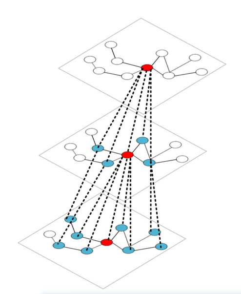 在本研究中,作者使用了简化的GCN版本。首先,采用一阶近似设置每个图卷积层来处理相邻一层的邻居特征,然后根据分层传播规则叠加多个图卷积层,达到多层邻居特征传播的效果。其感受野的变化效果图2所示。