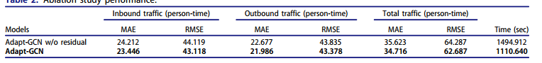 为了评估模型中组件的有效性,我们设计了消融实验,并在上海地铁数据集上测试了Adapt-GCN的变体。具体来说,Adapt-GCN w/o residual是指Adapt-GCN模型中残差连接块的移除。下表为去除残留连接后的Adapt-GCN预测结果。从表中可以看出,在上海数据集上,Adapt-GCN优于无残差的Adapt-GCN,说明残差连通性对提高预测性能有积极作用。