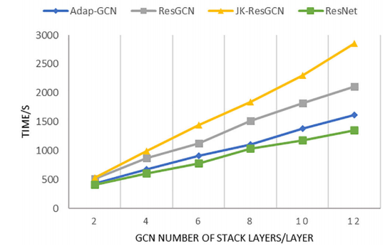 在比较模型中,①STGCN采用两个一维时间门控卷积夹在一个图卷积层中间的三明治结构,形成一个时空卷积块,并通过堆叠四个时空卷积块构建深度图卷积网络。虽然该模型可以同时捕获时空特征,但它将CNN1D输出的特征矩阵作为GCN的输入,与直接从原始输入数据中挖掘空间特征相比,导致GCN对空间特征的捕获不足。②ResNet中的CNN结构适用于普通栅格数据,这显然不适用于一般的拓扑地图数据。③在ResNet中叠加多个GCNs的过程中,出现过平滑的现象,过度消除了数据中的变化和细节。④JK-ResGCN在ResGCN的基础上增加了跳跃知识网络,有效解决了过度平滑问题,但跳跃知识网络将每个GCN层的输出以拼接的方式放入最终的融合层,并且随着GCN层的堆叠,融合层的输入通道数量会增加,这使得融合层在特征学习上花费更多的时间。