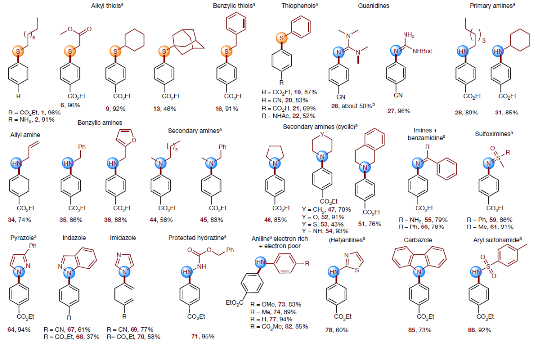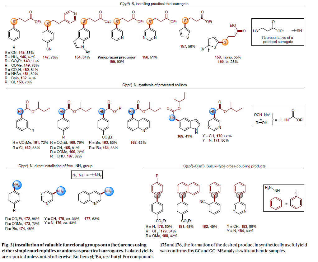 随后,作者对Group I中环己基硫醇亲核试剂与4-溴苯甲酸乙酯的C(sp2)-S偶联反应进行了考察(Fig. 2)(Fig. 3)。当使用稳定的NiBr2·glyme(10 mol%)作为镍源,4CzIPN(0.2 mol%)作为光催化剂,在DMA(dimethylacetamide)中光引发下反应1小时可以以92%的分离产率得到目标C(sp2)-S偶联产物9。值得注意的是,简化的反应条件与传统交叉偶联反应不同,因为体系中不需要使用任何碱、常规配体和其他添加剂。此外,当加入1.0 equiv. 47% (m/m) HBr/H2O溶液可以加速4-溴苯胺与不同硫醇的偶联(Figs. 2,2和Figs. 3,146)。在此体系下,一系列一级硫醇(1-8,包括-SH替代品15,145-159),二级硫醇(9-12),三级硫醇(13-15),苄基硫醇(16-18)和硫酚(19-25)均可以顺利实现转化,可以以几乎定量的分离产率得到相应的产物。此外,Group I亲核试剂的反应条件对于不同亲核试剂参与的其它成键反应(-P、-Se和-N)仍然有效(硒酚135(83%),二苯基氧膦115-117(81-96%),N-Boc胍27(96%))。