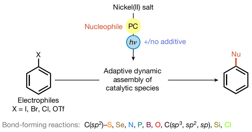 过渡金属催化的C(sp2)-(杂)原子偶联反应是迄今为止探索最多的有机转化之一。它既可以有效地构建分子,又能方便地提升分子的复杂性,并在许多学科中具有广泛的应用。在过去的50年里,大量的文献都是围绕钯、铜、镍和其它金属催化所展开的。尽管目前化学家们在合成方法的发展方面已经取得了重大成就(包括最近将过渡金属与光化学结合),但反应所需的各种配体、预催化剂、碱、添加剂、反应条件以及偶联配偶体的电子和/或结构多样性仍然为合适的反应参数选择带来一定的挑战。虽然高通量筛选方法的发展以及机器学习的发展可以有效的促进特定偶联反应最优条件的发现,但均需要产生额外的相关成本。最近,德国雷根斯堡大学Indrajit Ghosh和Burkhard König课题组发展了可见光驱动的氧化还原反应条件下,镍自适应动态均相催化的C(sp2)-(杂)原子偶联反应。在可预测的反应条件下,作者利用九种不同的成键反应C(sp2)-S, Se, N, P, B, O, C(sp3,sp2,sp), Si, Cl)实现了数百个分子的合成。