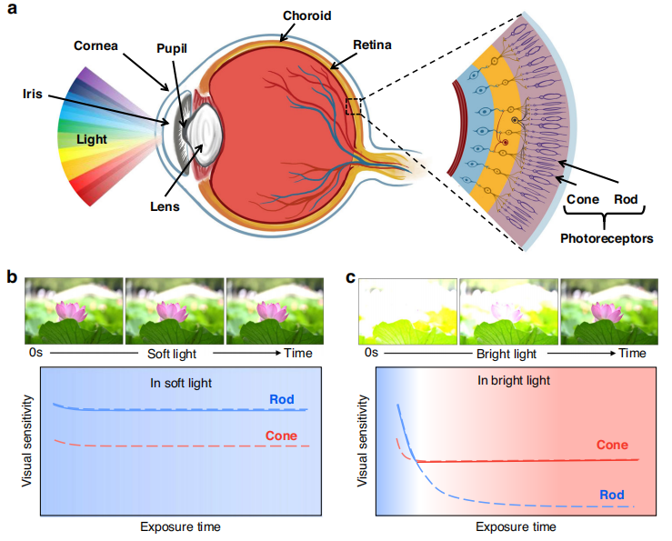 通过此,它可以对光强和波长进行分辨,从而产生自适应的光响应。