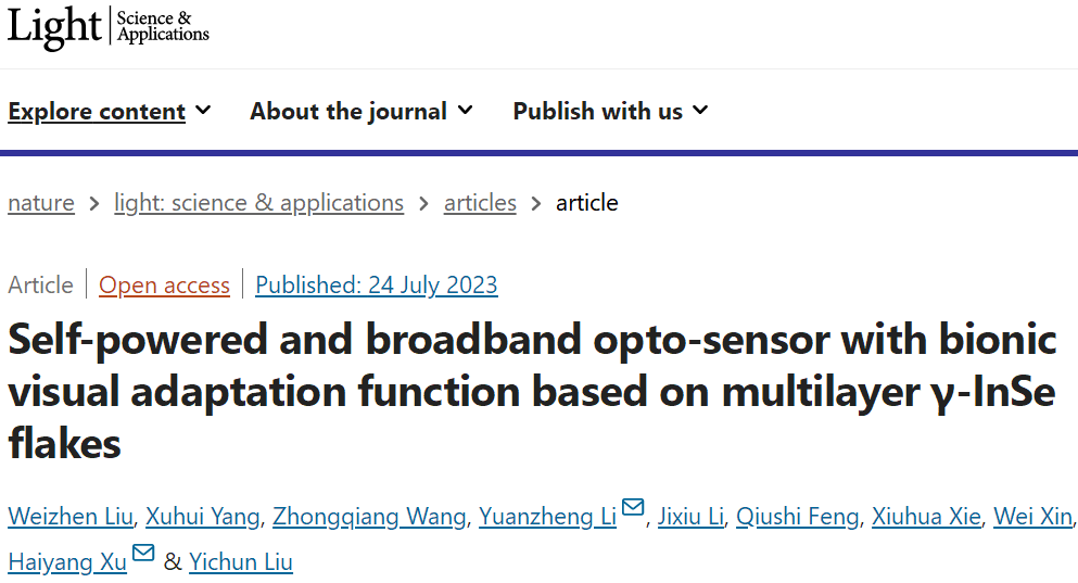 最终,相关论文以《基于多层 γ-InSe 薄片的具有仿生视觉自适应功能的自供电宽带光传感器》(Self-powered and broadband opto-sensor with bionic visual adaptation function based on multilayer γ-InSe flakes)为题发在Light: Science & Applications(IF 19.4)。东北师范大学李远征副教授和徐海阳教授担任共同通讯作者[1]。