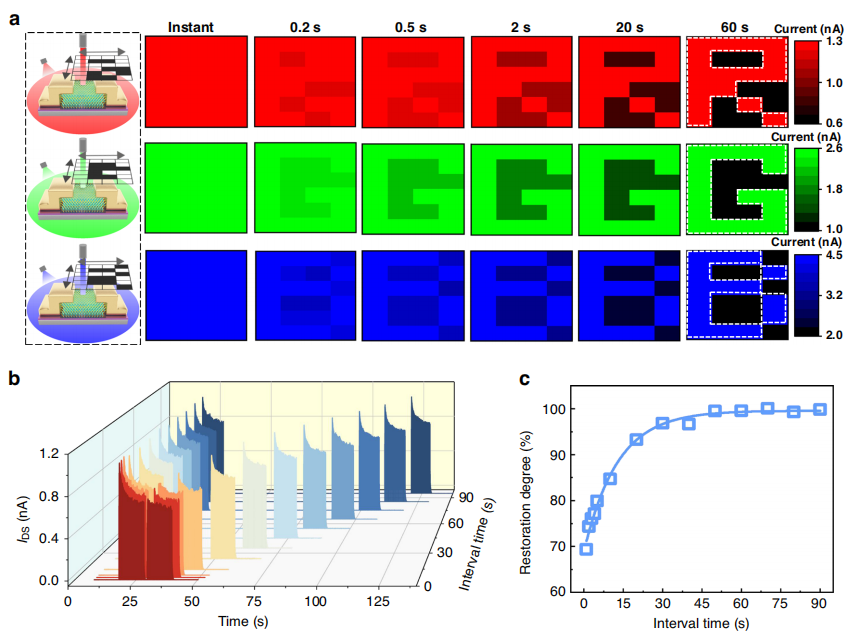 接着,他们在红、绿、蓝光波段测试了器件的图像感知效果。结果显示:当针对器件的响应电流值,把各波段的灰度值区间加以定义,传感器就能在 2 秒之内完成感知适应,从而得到清晰的图像信息。而这就像人眼能够适应各种颜色的光线一样。